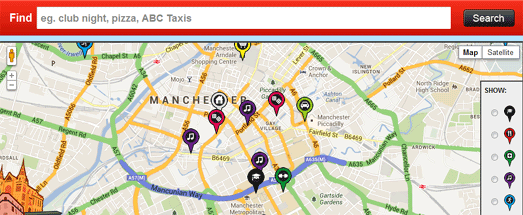 Student Map includes a Google Map of the best places, events as well as discounts for students inward Manchester, UK. The map allows students to filter the results shown on the map past times category. As good every 2nd the map the site includes features on educatee life inward the city, including guides to local nightclubs as well as upcoming events.